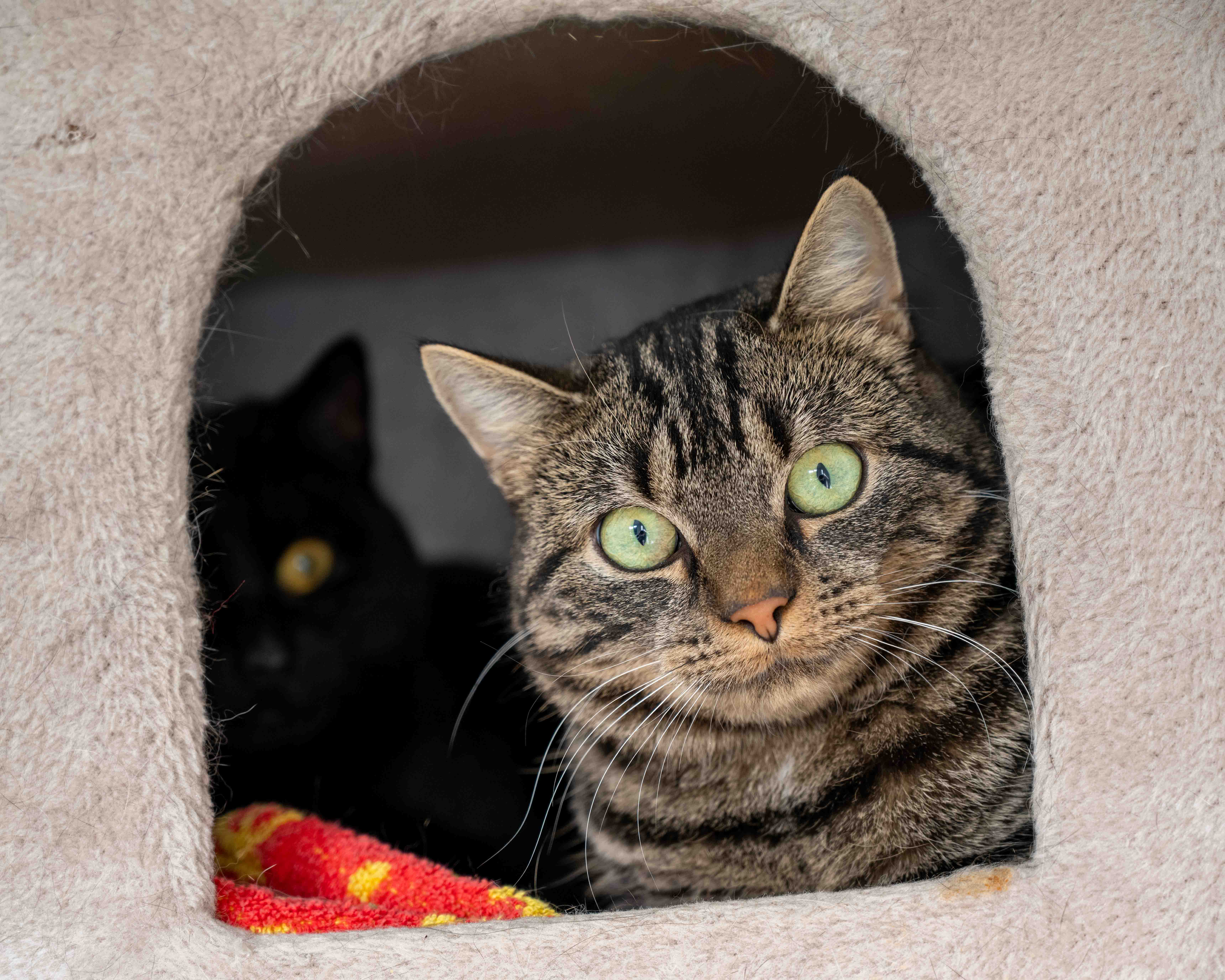 Ik ben echt meeeega verlegen.. Daarom zit ik op mijn laatste foto verstopt achter een van mijn vrienden, Chica. Ik zoek een rustig huisje, het liefst met een ander katje waar ik me aan kan optrekken als ik bang ben. Verder zou ik een tuin ook wel lekker vinden om uiteindelijk in te kunnen rennen en klimmen!