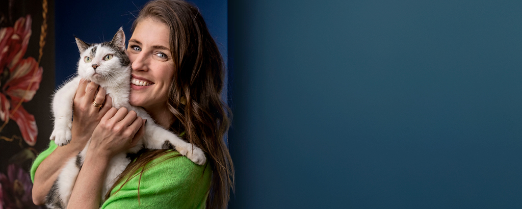 ‘Het gekke is dat ik nooit echt een kattenmens was. Maar toen een vriendin een poes kreeg, groeide ik helemaal in het idee: dat lijkt mij ook ontzettend leuk. Ik woonde op 29 vierkante meter. Dat vond ik zielig. Maar toen ik ruimer ging wonen dacht ik: dit is het moment!’