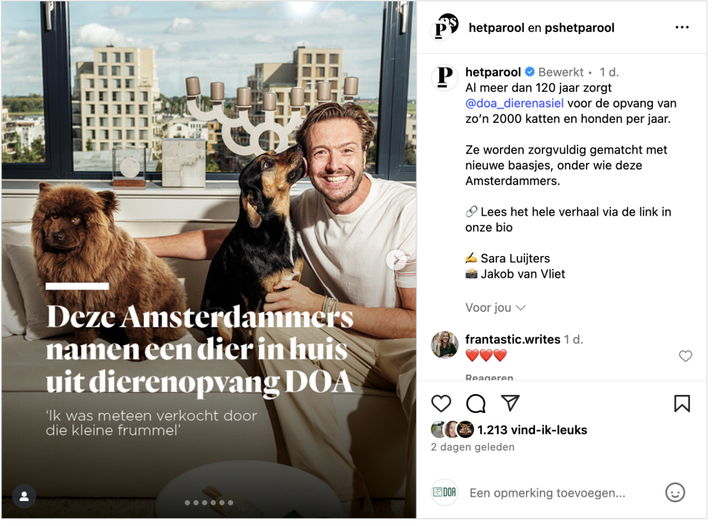 De Libelle heef op haar online platform en op social media adoptieoproepen, filmpjes van asieldieren en een artikel gedeeld ver DOA. Bekijk hier de artikelen: