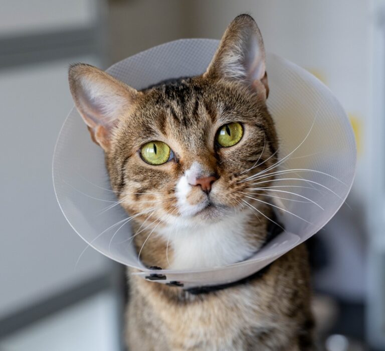 En dan bedoel ik niet dat ik een naaktkat ben, nee ik heb het mijzelf aangedaan. Toen ik bij DOA binnenkwam had ik ontzettend veel vlooien, en dus heel veel jeuk. Veel katten gaan dan heel hard krabben. Dat deed ik ook wel hoor, maar wat ik vooral veel heb gedaan is likken, likken, en nog eens likken. Van voren was ik een knappe cyperse dame en van achteren was ik kaal! Een gek gezicht, want mijn staart leek een beetje op een rattenstaartje! Enfin, bij DOA hebben ze een hekel aan vlooien dus daar was ik snel vanaf, maar de jeuk ging niet zomaar over. Het likken werd zo erg dat ik mijn huid kapot maakte. Op mijn achterpoten en staart zaten meerdere schuurplekken en wondjes. Dat moest genezen en de enige manier was een kap. Best onhandig zo’n ding, maar het gaf ook rust. Al na twee dagen was ik wat meer gekalmeerd. Nou moet ik zeggen dat het speciale voer, de zalfjes en de medicatie ook wel hielpen hoor. Inmiddels zijn we wat verder en is de kap niet meer nodig. De zalfjes hoeven ook niet meer en mijn streepjes groeien langzaam terug. Wel eet ik nog speciaal voer en krijg ik anti-jeuk medicatie. En of ik nou een kap om had of niet, ik sprong echt bij iedereen op schoot en liet luid van mij horen. Ik ben zo blij dat DOA mij zo heeft geholpen en dat ik weer een beetje kan genieten van het leven!